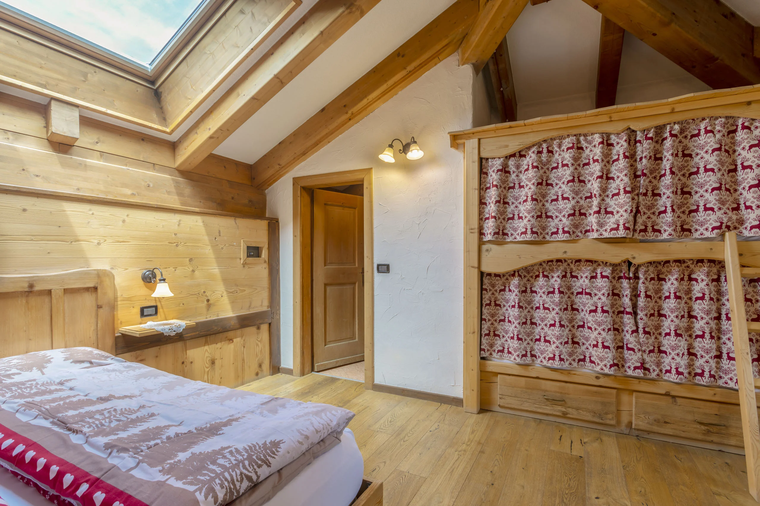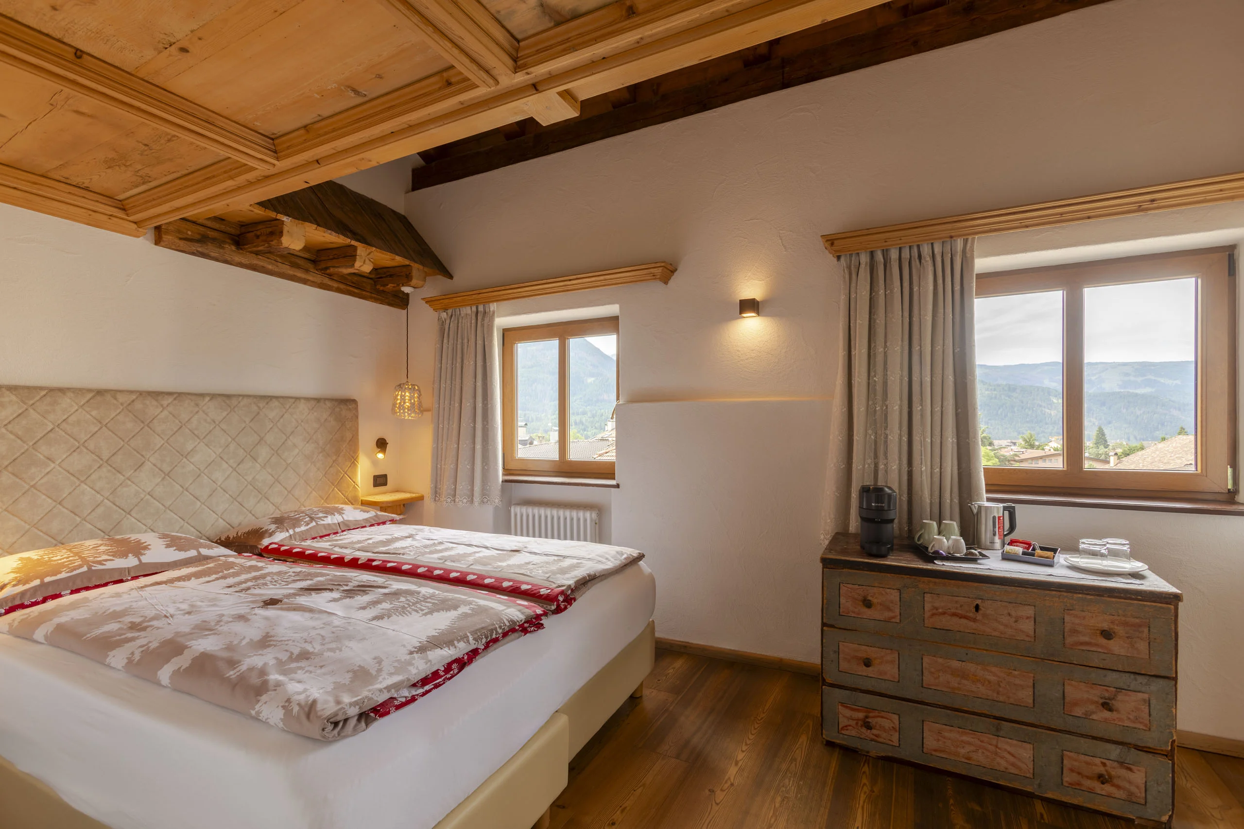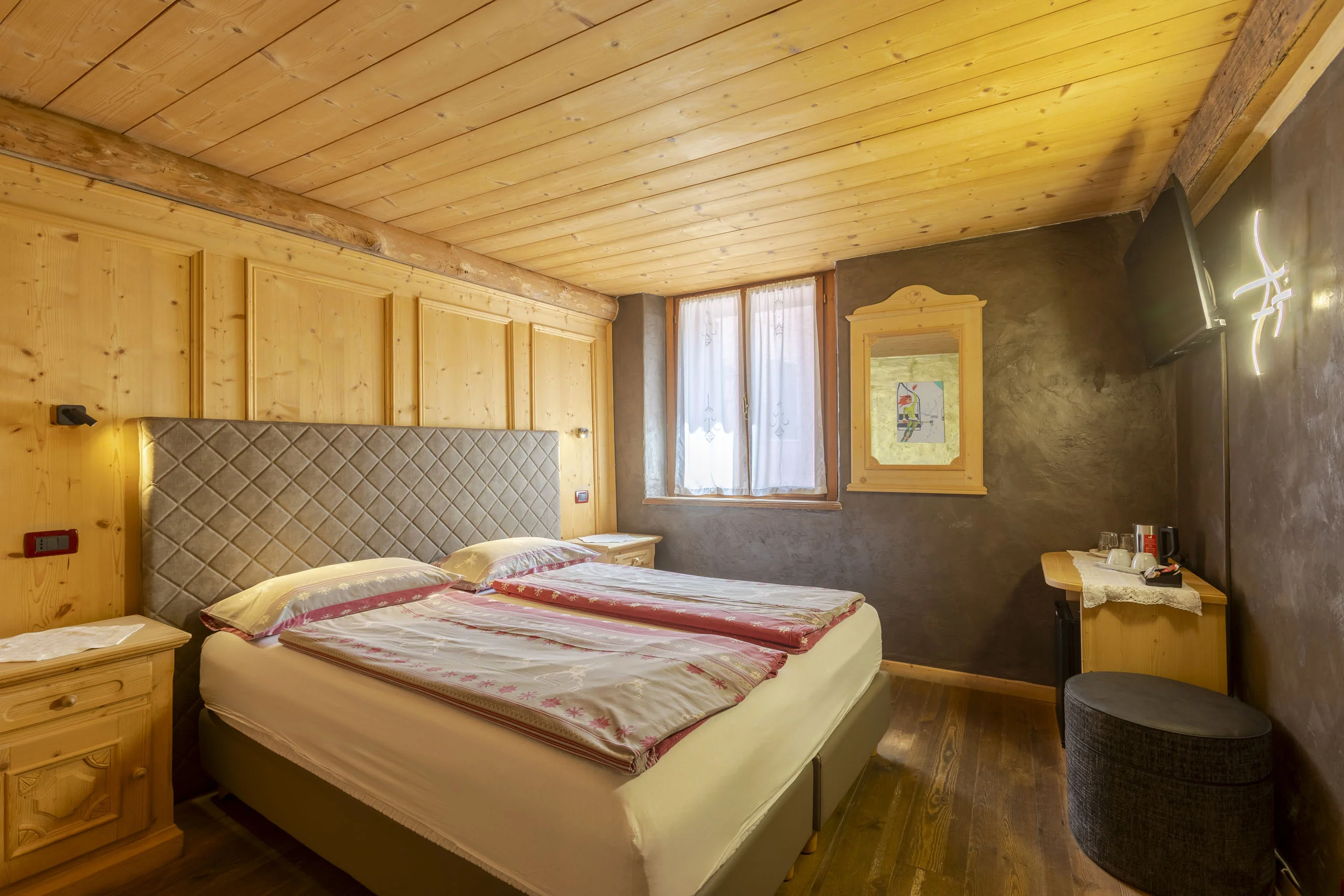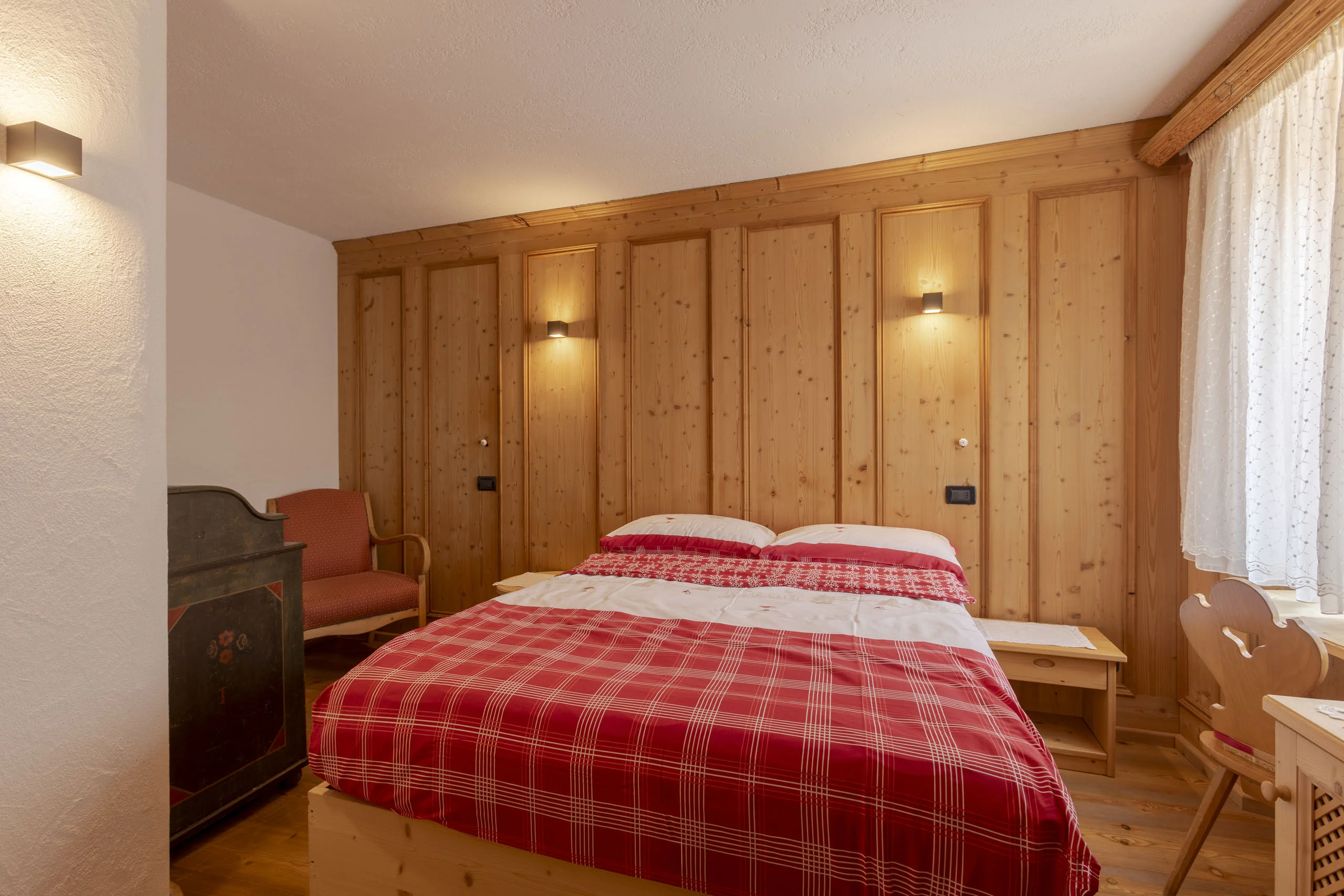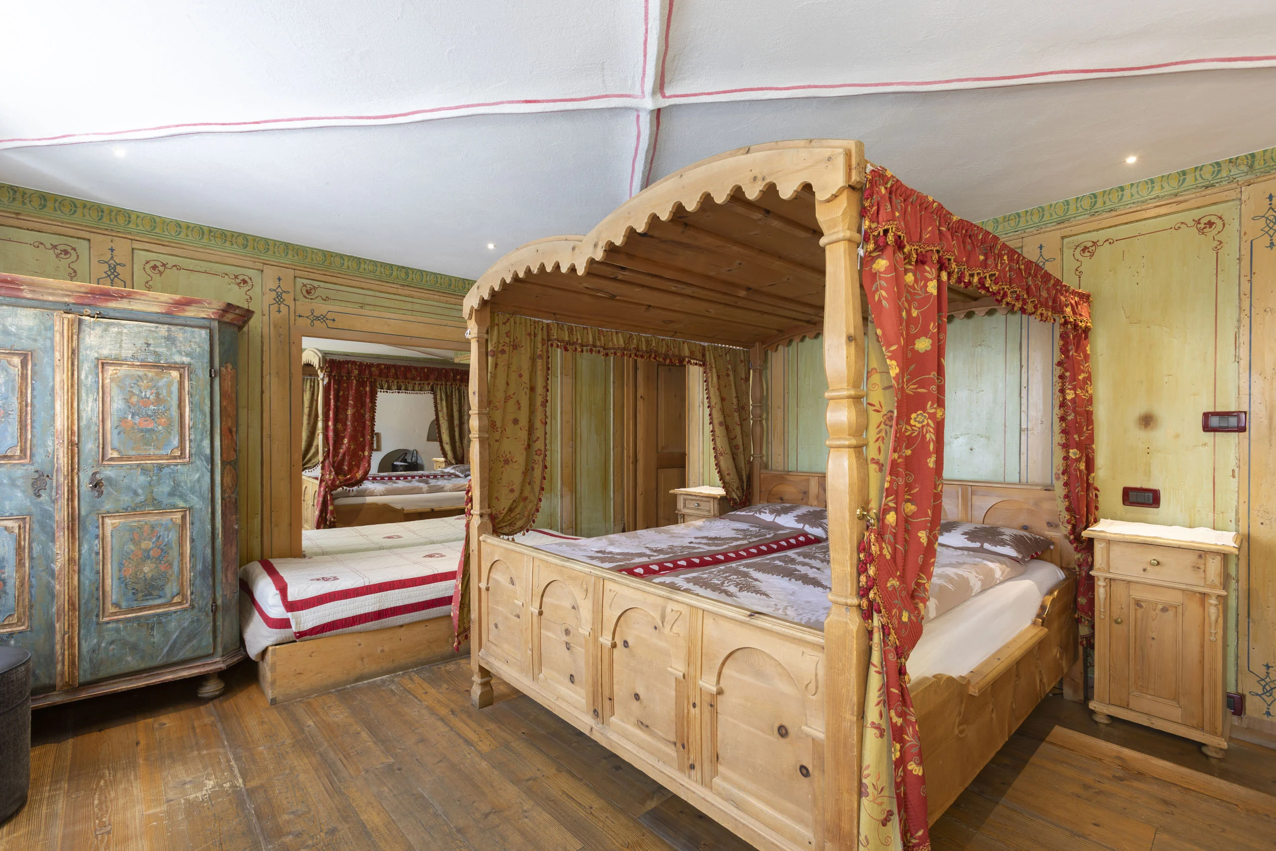 Le camere più ampie della Stüa. Tutte rivestite in abete proveniente dai boschi della Magnifica Comunità di Fiemme — il profumo entra con voi e resta per tutta la notte.
