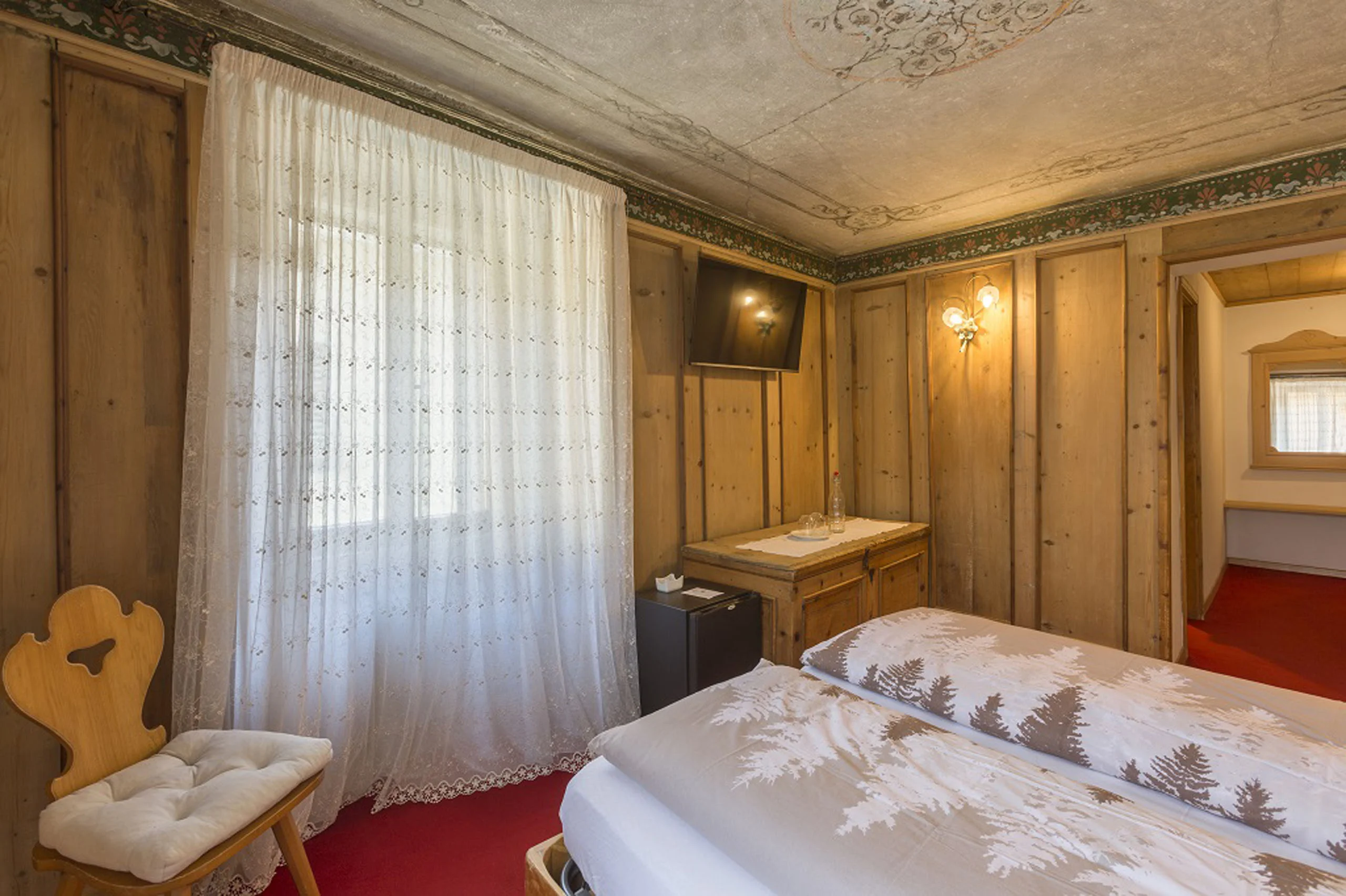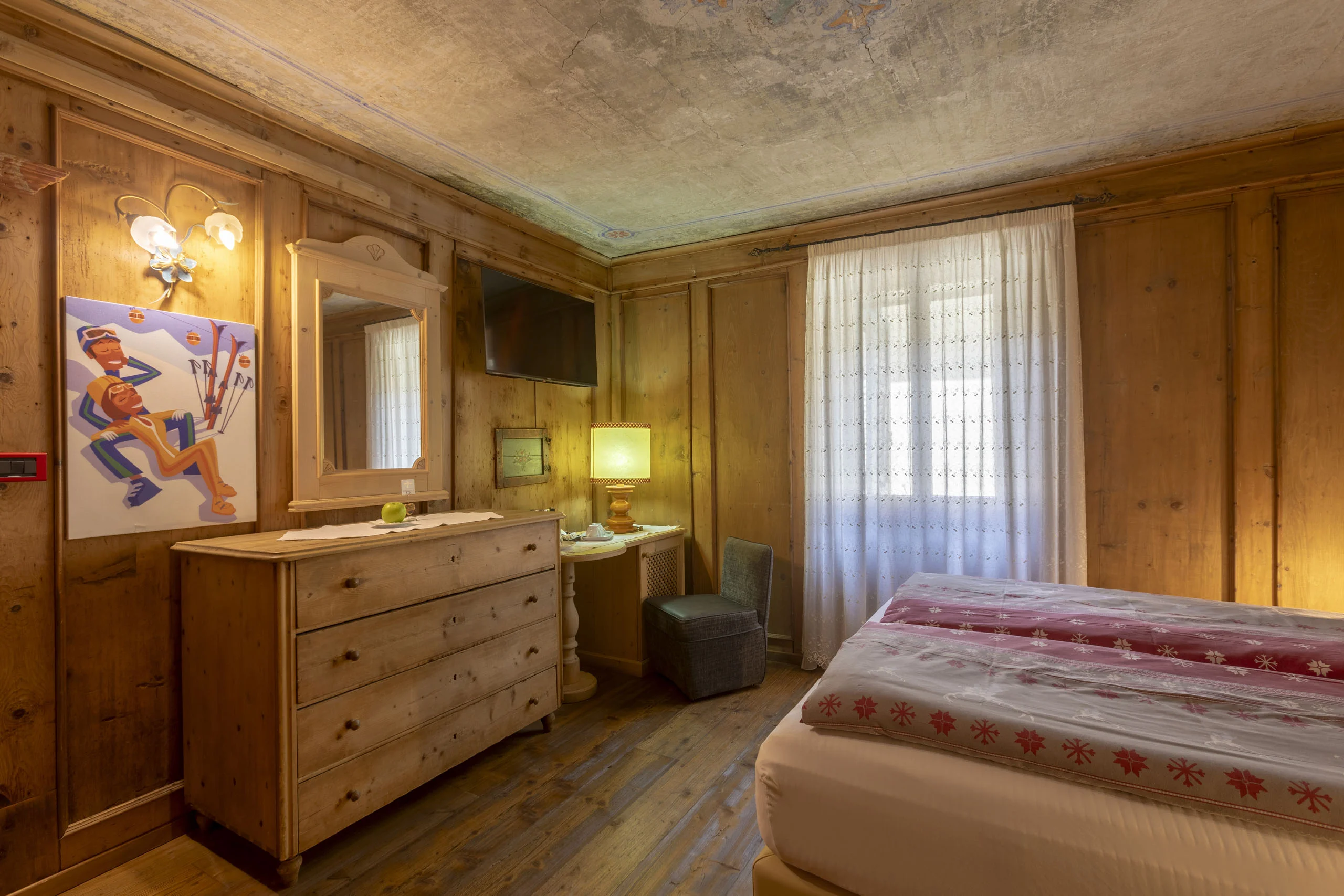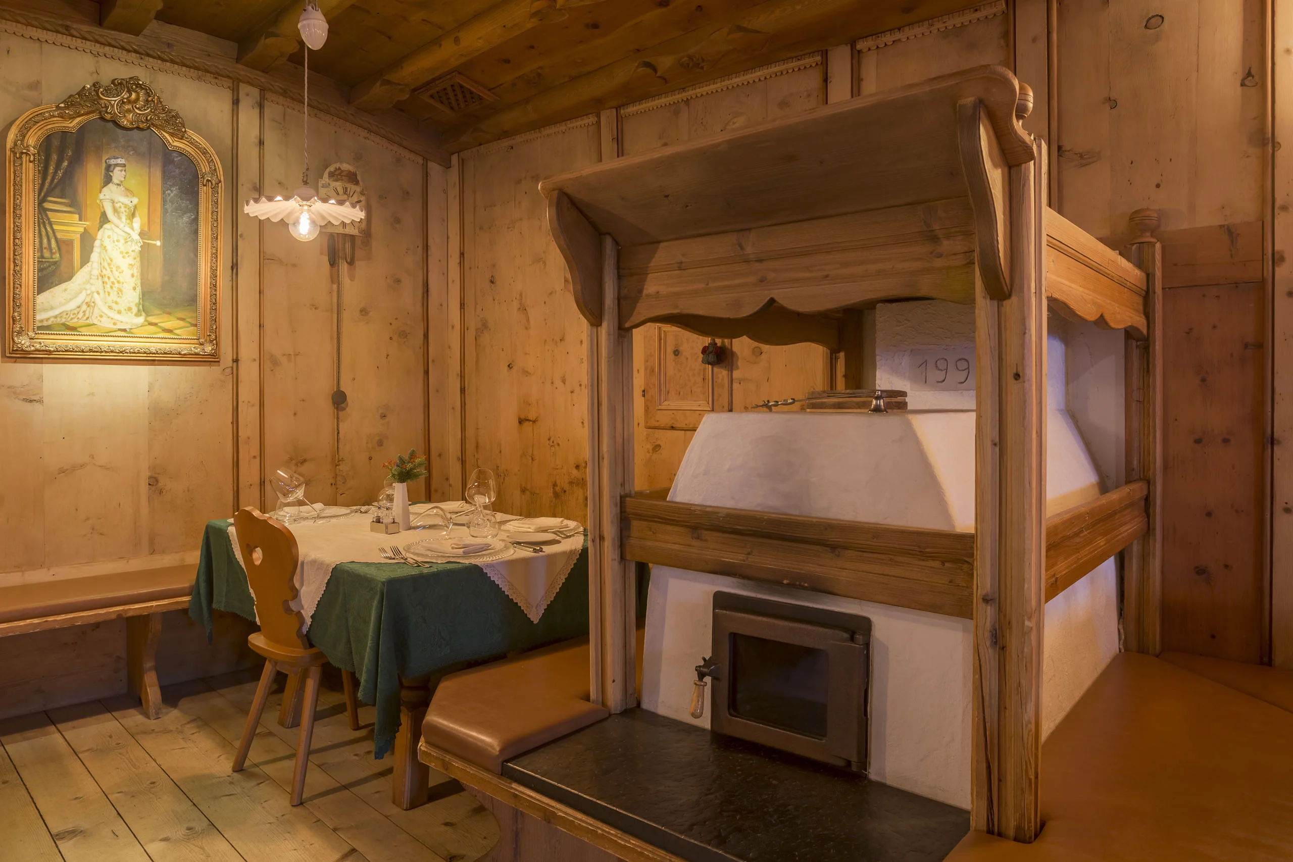La stanza più antica dell'hotel. Una stube originale dell'Ottocento con stufa in maiolica del tempo, soffitto di affreschi e quadri antichi alle pareti. Dormirci è attraversare due secoli in una notte.