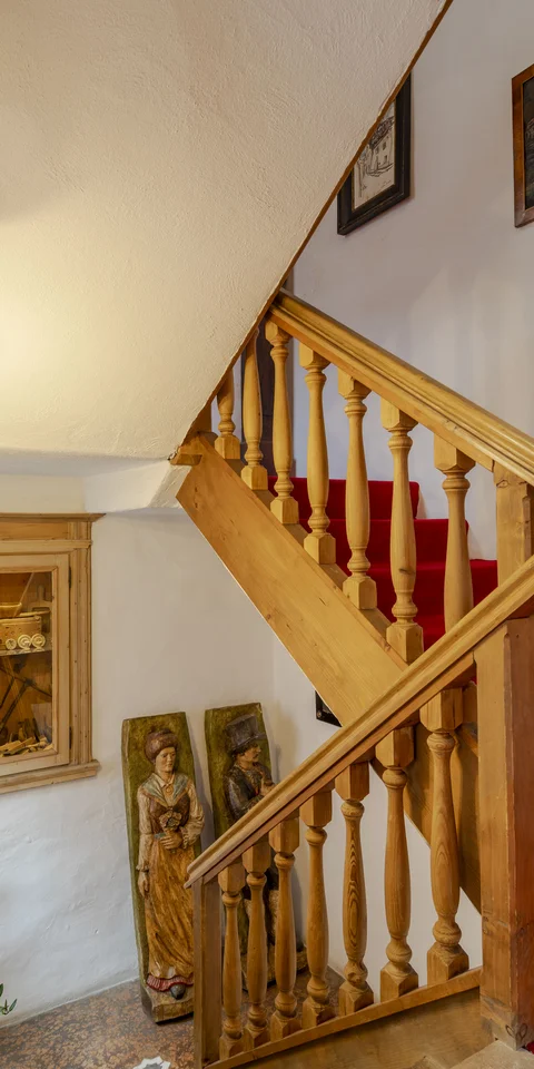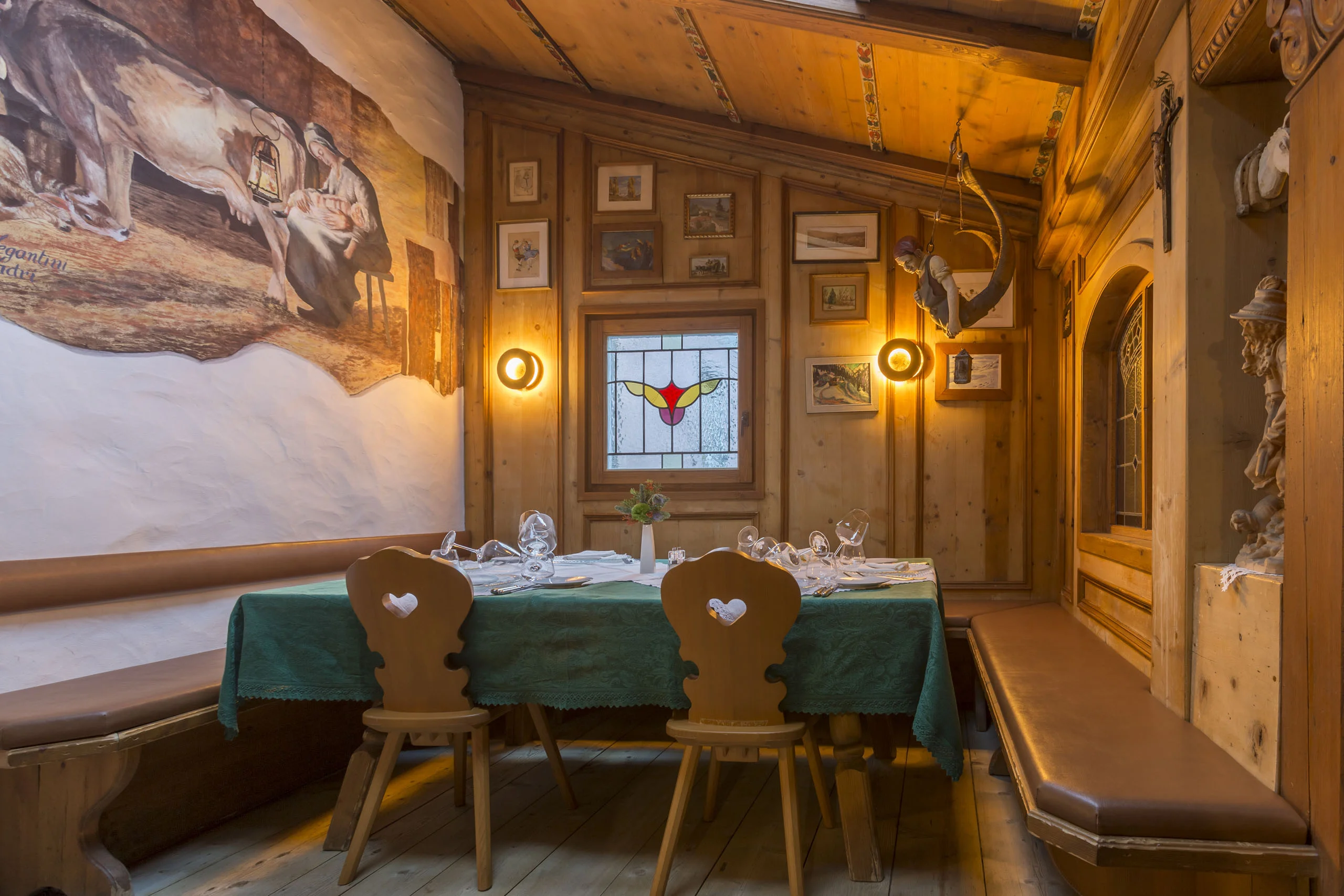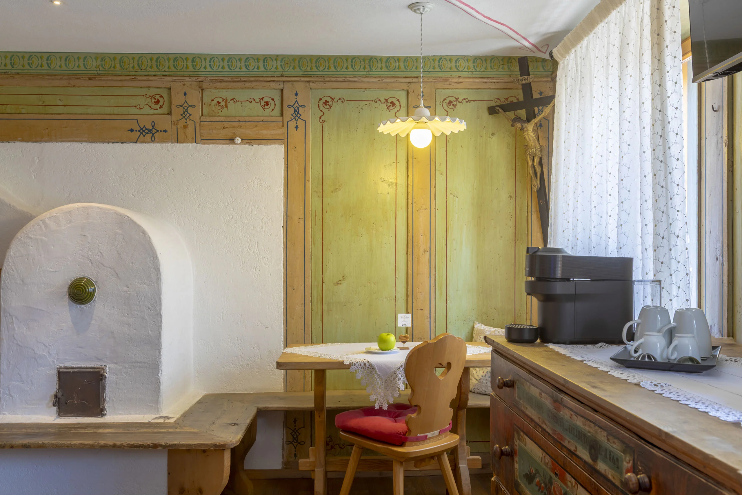 La stanza più antica dell'hotel. Una stube originale dell'Ottocento con stufa in maiolica del tempo, soffitto di affreschi e quadri antichi alle pareti. Dormirci è attraversare due secoli in una notte.